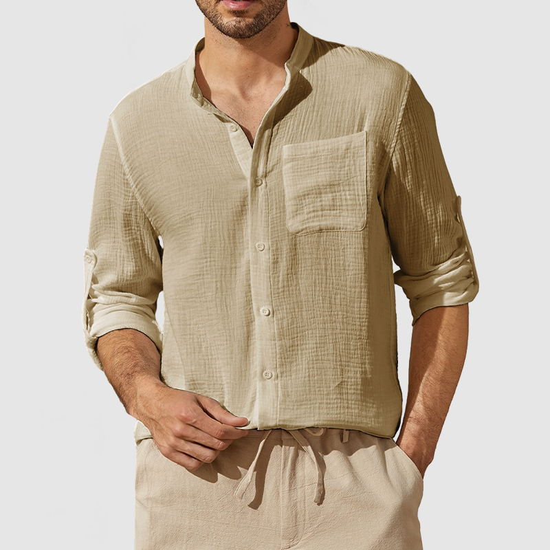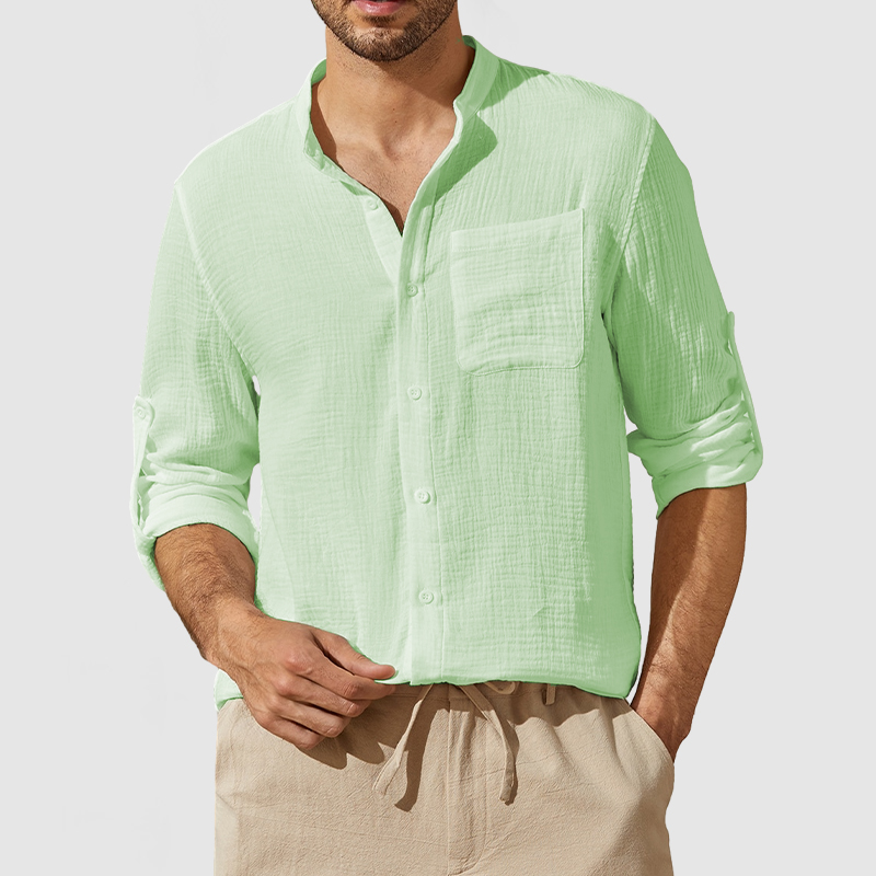 This shirt has a business-casual style element and is made from Cotton, which is extremely breathable. This shirt features a stand-up collar with chest pocket detail and the sleeves are two ways to wear, which will make this shirt less monotonous. The soft and breathable textured cotton linen fabric brings you endless comfort! Whether for outdoor sports, leisure activities or social gatherings, this shirt will keep you elegant and gentlemanly for a long time.
